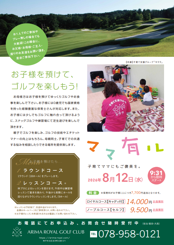 子供達はゴルフ場ならではの過ごし方で楽しんで頂き、好評のお声を頂戴し、各メディアでも取り上げて頂いております一時保育「ママ有ル」。 「ママ有ル」の輪が広がってきており、参加者様からは「ゴルフ再開のきっかけになりました」「ママ友をお誘いしますね」や、お父様からは「妻もゴルフが好きなので夫婦で喜んでおります」とたくさんのお声を頂戴しております。