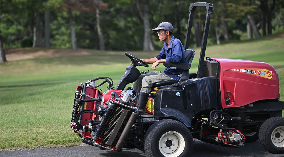 早朝6時30分頃からグリーンの刈り込みを行い、午後からはフェアウェイ刈り込み、ホールカットを行っています。